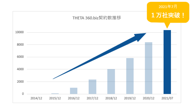 リコー(東京都大田区)は、同社が提供する360度画像のバーチャルツアー作成サービス「THETA 360.biz」の契約数が1万社を突破したと発表した。サービス開始から、主に不動産業のバーチャル内見に使われてきたが、近年のリモートワーク、DX推進の影響で需要が急拡大しているといい、建築会社、中古車、会社、学校、展示会などの施設紹介など、さまざまな用途で利用されているという。