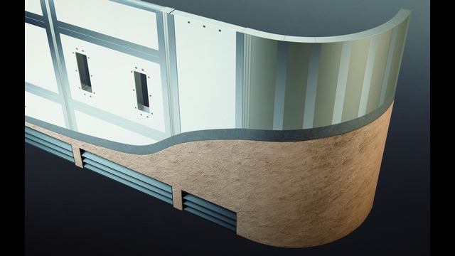 専用の部材を使うことで曲面(R600)やコーナーなどの仕上げにも対応。また、開口(角、丸)を設けたパネルや、縦格子やルーバーを組み込んだパネル、現場での加工ができるパネルもあり、ブロック塀では実現しにくい形にも対応できる。