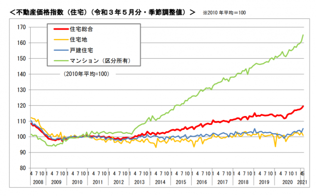 国土交通省は8月31日、2021年5月分の不動産価格指数(季節調整値)を公表した。2010年平均を100として算出したもので、全国の住宅総合は前月比1.1%増の119.5となった。住宅地は同2.0%減の101.0、戸建住宅は同2.4%増の105.3、マンション(区分所有)は同2.5%増の165.0だった。