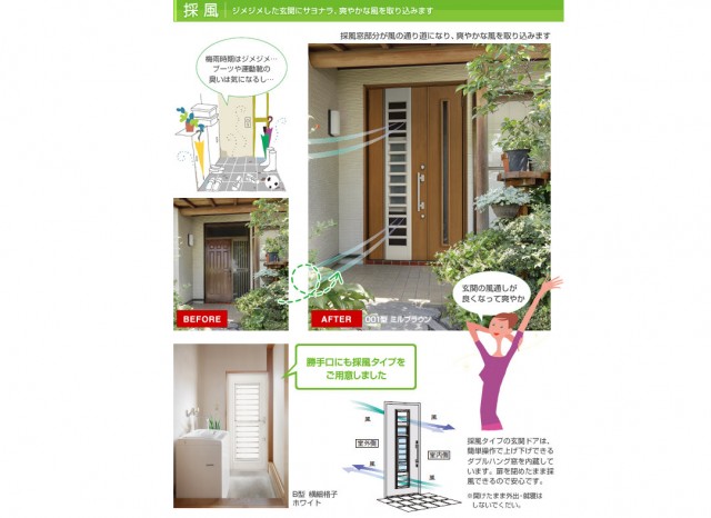 製品は、既存のドア枠を撤去せず、上から新しいドア枠をかぶせる「カバー工法」を採用。外壁を壊さずに施工できるため1日で施工完了できる。玄関ドア・玄関引戸・勝手口の3タイプがあり、製品によって高断熱仕様、ドアを閉めたまま通風を確保できる採風仕様、採光仕様、防犯仕様などをそろえる。