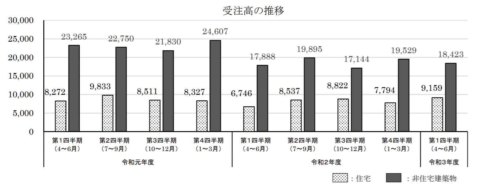 住宅を工事種類別に見ると、増築工事が57.6%増の216億円、一部改築工事は36.6%増の343億円、改装・改修工事が41.9%増の6662億円。維持・修理工事が16.6%増の1938億円となった。
