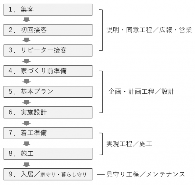 この「2.初回接客」は、先の「1.集客」で顕在化した顧客に対して、自社およびその家づくりのことをちゃんと「理解・納得してもらう工程」であると位置付けられます。