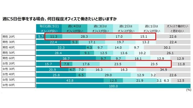 『週に5日仕事をする場合、何日程度オフィスで働きたいと思うか』聞いたところ、「週に1日~4日」のいずれかはオフィスで働きたいと答えた人が合わせて51.2%(「週に1日」が12.4%、「2日」が15.6%、「3日」が15.8%、「4日」が7.4%)と、2人に1人がオフィスとテレワークを組み合わせて働くハイブリッドワークをしたいと考えていることがわかった。特に20代の男女においては、ハイブリッドワークを希望する人が70%以上に上った。一方で、「毎日(週5日)オフィスが良い」は25.6%、「オフィスで働きたいと思わない」は23.2%だった。
