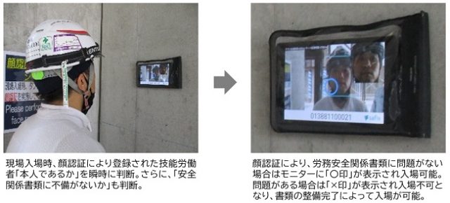 これまでは、現場担当者は技能労働者の現場入場記録や、入場に必要な安全関係書類の確認などに1日あたり約1時間を要していたという。業務効率化を目的として顔認証システムを導入したところ、本人確認や事前登録情報(雇用関係、健康診断・資格・保険加入状況など)の確認を自動的に実施することが可能になり、現場担当者が毎日行っていた書類確認業務が不要となることで、1人あたり年間で252時間の労働時間削減につながった。さらに、どの現場に、どこの技能労働者が、いつ入場したか、を確認でき、災害リスクが高いとされる高齢・有疾患の技能労働者に対する注意喚起や安全指導の強化も可能となったとしている。