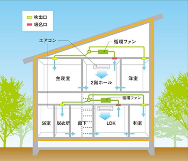 Airフローシステムは、1階リビング、2階ホールにエアコンを設置し、エアコン付近の吸込み口から冷風・温風をファンの力でダクトを通じて各空間に循環させるしくみ。それぞれのフロアをほぼ一定の温度に保つことができるため、ストレスを感じることなく年間を通して健康・快適に過ごすことができる。「在宅時間が増え、光熱費を気にする家庭が増えてきたなか、顧客のランニングコストだけでなく脱炭素社会へ向けた地球環境にも配慮した住まいとなっている」と同社。