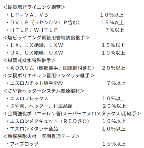 積水化学工業(大阪市)は、11月1日出荷分から同社が製造・販売する建築設備配管に関わる製品12品目を値上げする。値上げ幅は、7%~20%以上としている。硬質塩ビライニング鋼管で7%~15%以上、塩ビライニング鋼管用管端防食継手で10%~15%以上、単管式排水特殊継手で20%以上など。