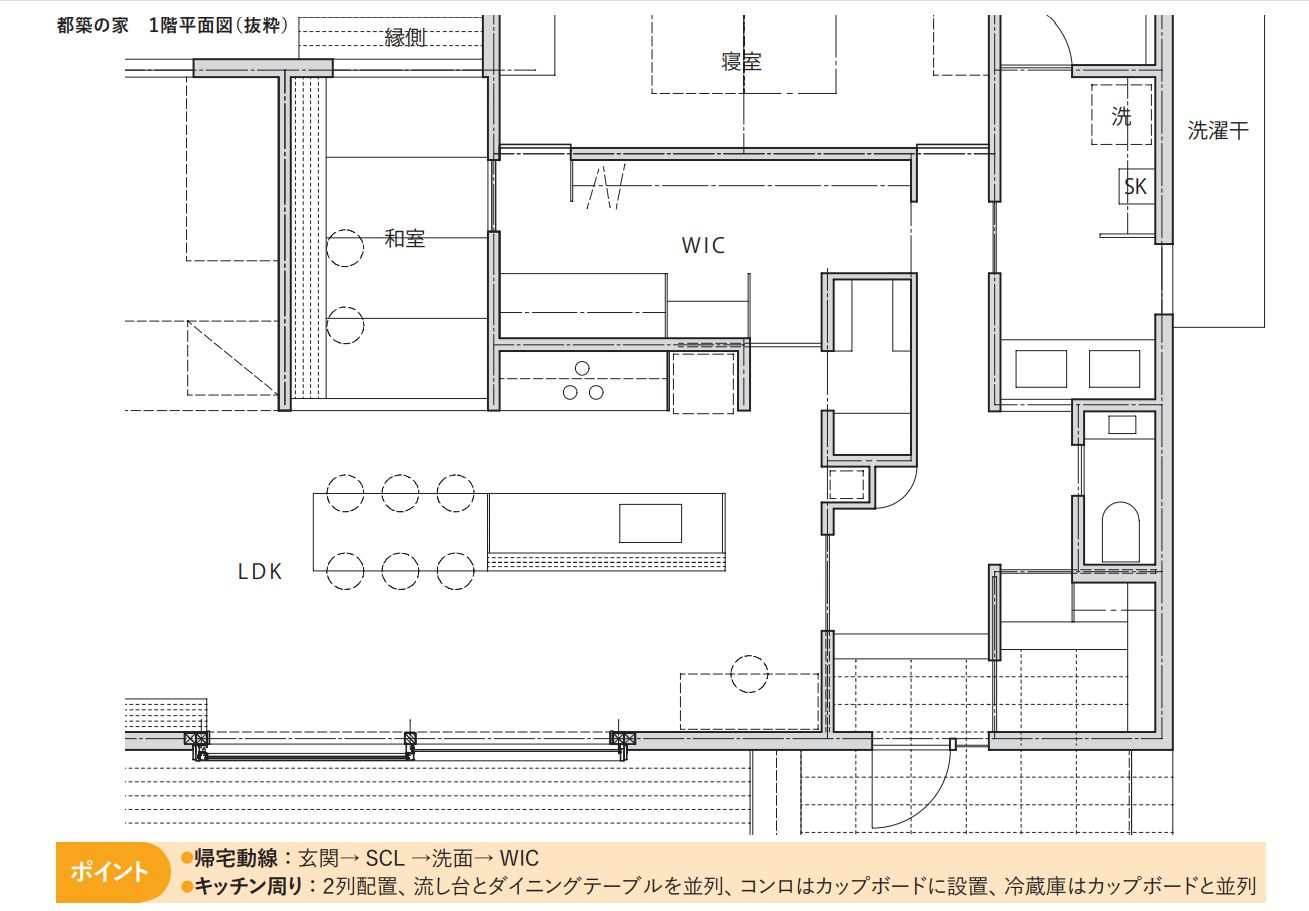 ポイントの 1つが帰宅時の動線だ。子供が帰宅したときにリビングに直行して鞄を置き、上着を脱ぎ放しにするということがよくある。これを避けるには玄関から家に上がるときにWICに上着を仕舞い、洗面で手を洗ってからリビングに入る動線が望ましい。たとえば玄関→ WIC→洗面、玄関→SCL→洗面といった動線である。玄関脇に収納室を設ける場合はダブルアクセスで出入りできるようにして、裏動線に組み込むと使い勝手がよく、省スペースにもなる。WICは夫婦の寝室に組み込むことが多いが、家族共用の収納として集約することで省スペースになる。WICの利用率を高めるには子供部屋やLDKからもアプローチしやすい場所に配置するとよい。