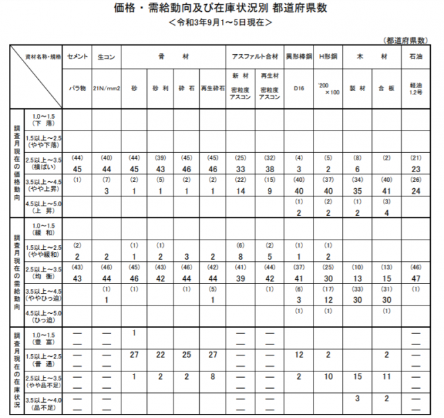 国土交通省は9月27日、同月1~5日に行った「主要建設資材需給・価格動向調査」の結果を発表した。セメント、生コンクリート、骨材、アスファルト合材、鋼材、木材、石油の7資材13品目について、価格動向は異形棒鋼、H形鋼、木材(製材・型枠用合板)が「やや上昇」、それ以外の資材は「横ばい」だった。需給動向は木材(製材・型枠用合板)が「ややひっ迫」で、それ以外は「均衡」。在庫状況はH形鋼、木材(製材・型枠用合板)が「やや品不足」、それ以外は「普通」だった。