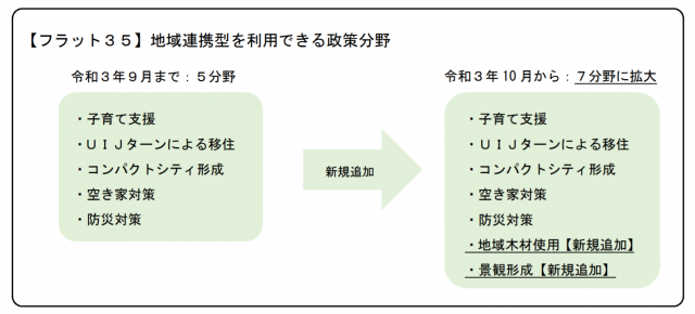 【フラット35】地域連携型は、子育て世帯や地方移住者などのマイホーム取得を支援するために、地方公共団体の財政的支援とセットで【フラット35】の借入金利を一定期間引き下げるというもの。これまでは、「子育て支援」「UIJターンによる移住」「コンパクトシティ形成」「空き家対策」「防災対策」の5分野の補助事業が対象だった。
