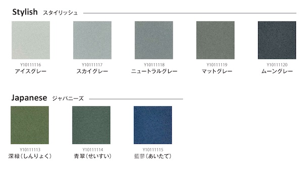 割れに強く、低汚染性・耐候性に優れた外装用塗材。今回は、グレー系の「スタイリッシュシリーズ」にアイスグレー・スカイグレー・マットグレーなど5色を、落ち着いた色調の「ジャパニーズシリーズ」に深緑(しんりょく)・青翠(せいすい)・藍蓼(あいたて)の3色を新たにラインアップした。
