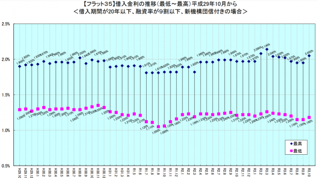 返済期間20年以下の「フラット20」の最低金利は、融資率9割以下が1.18%、9割超が1.44%で、いずれも前月から0.03ポイント上がり、7カ月ぶりの上昇となった。最高金利は、9割以下が2.05%、9割超が2.31%で、いずれも0.10ポイント上昇した。