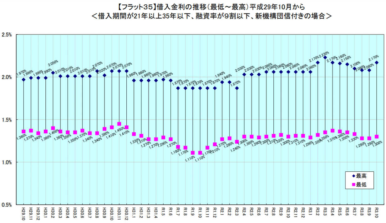 住宅金融支援機構(東京都文京区)は10月1日、住宅ローン「フラット35」取扱金融機関が適用する10月の融資金利を発表した。返済期間21年以上35年以下の最低金利は、融資率9割以下が1.30%、9割超が1.56%と、いずれも6カ月ぶりに上昇した。最高金利は、9割以下が2.17%、9割超が2.43%で、前月から0.09ポイント上昇した。