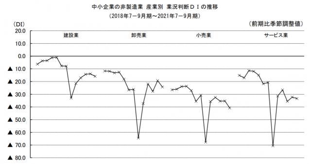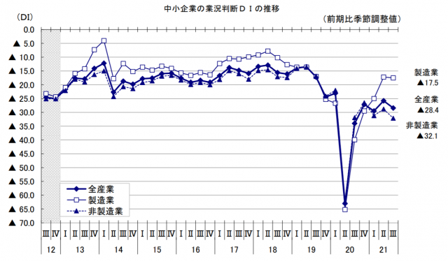 中小企業庁と中小企業基盤整備機構は9月30日、第165回中小企業景況調査(2021年7-9月期)の結果をまとめ公表した。中小企業の業況判断 DI(「好転」と回答した企業の割合-「悪化」と回答した企業の割合)は2期ぶりに低下。建設業の業況判断DIは、マイナス15.9(前期差2.0ポイント減)とマイナス幅が拡大した。