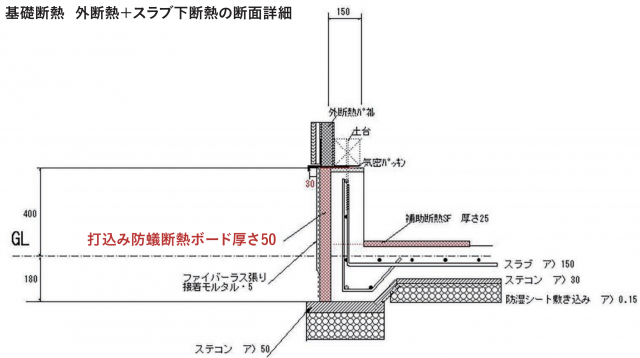基礎断熱に用いる断熱材にはシロアリが食い破らない材質が必要だ。「かつてはホウ酸を含浸させたEPSの防蟻断熱材を用いていたが、少し前からシロアリが物理的に食い破れない発泡ガラス断熱材に切り替えている」と中村さんは話す。だが最近になって輸入していた建材商社が取り扱いをやめてしまった。「今後は高額だが炭化カルシウム系やポリカーボネート系の硬い断熱材とするしかない」(中村さん)・・・・