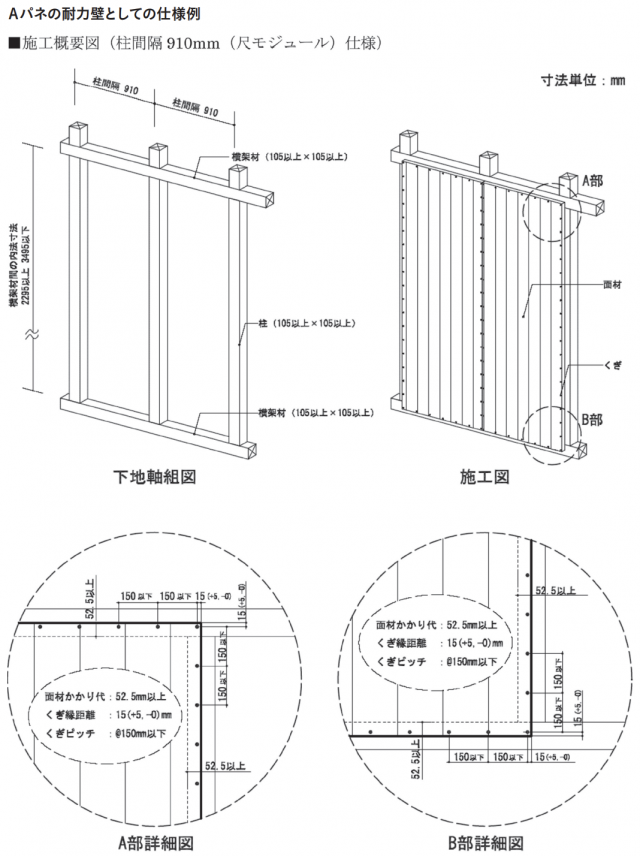 試行錯誤の結果、Aパネは910mmを基準とした尺モジュールで4.2倍、1000mmを基準としたメーターモジュールで4.5倍の耐力壁認定を取得した。Aパネとほかの耐力壁と組み合わせる場合、5倍を限度に倍率を加算できる。許容応力度計算などの構造計算を行う場合、さらに高い倍率の評価が可能になる。