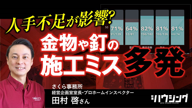 個人向けにホームインスペクションなどを提供するさくら事務所(東京都渋谷区)はこのほど、2019~20年に行った木造住宅の新築工事現場チェックで、構造部の検査を行った182件のうち、82%に当たる150件に施工不良が見つかったことを明らかにした。接合金物の付け忘れ、耐力面材の施工時に釘を打ち忘れるなどのミスが大部分を占めており、人手不足から現場管理が十分になされていない状況がうかがえるという。