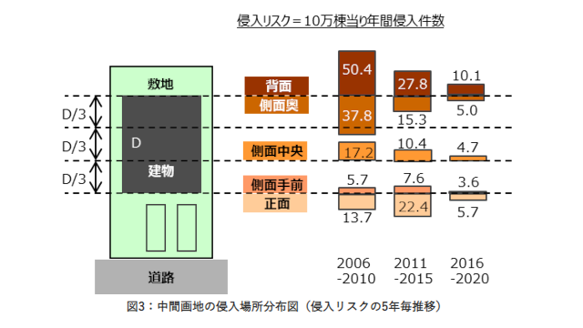 それによると、侵入被害に遭った住宅の約6割が、敷地の1辺のみが道路に接する中間画地だった。このうち1階からの侵入であり、侵入開口部の場所が特定できたものについて、建物の面を正面、側面手前、側面中央、側面奥、背面の5つに区分して集計を行った。その結果、道路からみて建物奥(側面奥と背面)に被害が集中する傾向があるものの、その数は過去15年間で大きく減少していることがわかった。建物の側面から奥に不審者を入れないように外構を施す「ゾーンディフェンス」が普及した効果と考えられるとする。