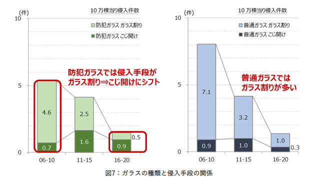 開口部への侵入被害を侵入手段別にみると、防犯ガラスでは「ガラス割り」の被害が減少した一方、「こじ開け」の比率が高まった。普通ガラスでは、「こじ開け」よりも「ガラス割り」のほうが多かった。なお、人が通れない幅の「スリット窓」からの侵入は無く、また、地盤面から高さ2mを超える「高窓」からの侵入被害も極めて少なかったことから、これらの窓は防犯効果が大きいとする。