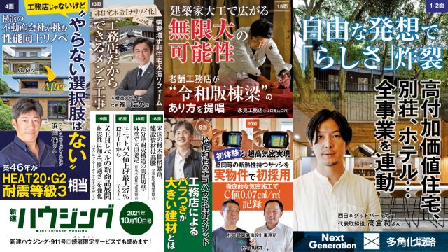 そのほか、住宅ライターの大菅力さんによる「最小人数で生き残るnano工務店の経営術」や、松尾和也さんの「エコハウス設計メソッド」など人気連載なども掲載しているほか、永見工務店(山口県山口市)が目指す“建築家大工”への取り組みをレポートしています。【栁原潤】