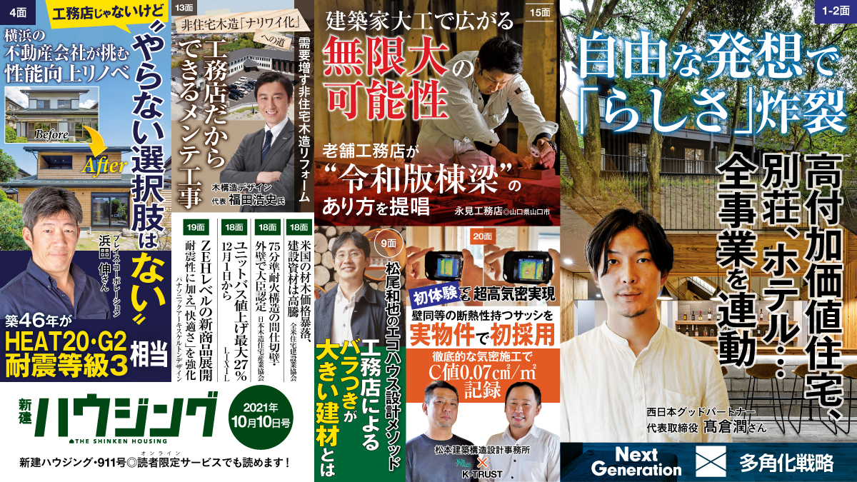 新建ハウジング最新10月10日号のトップ記事は、住宅業界の次世代を担う人材を追う「ネクストジェネレーション×多角化戦略」特集です。資産価値の落ちない、くらしつづける価値のある家づくり―を掲げ、大分県内で高付加価値住宅を展開する西日本グッドパートナー(大分市)を紹介しました。