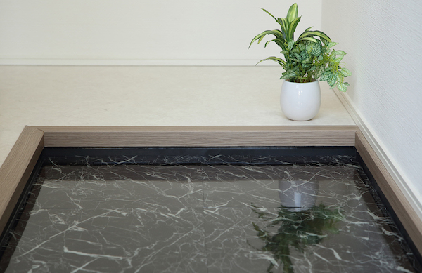 シナネンが培ってきた洗濯機防水パンの技術を住宅の玄関に応用。東リ(兵庫県伊丹市)との共同開発により、床材シートを一体化して成型した。これにより、従来の木造アパートの玄関床では、それぞれ異なる専門業者による(1)防水、(2)下地、(3)表面仕上げの3工程が必要だったが、新製品はそれらを解消。玄関土間の大きさに合わせてトレイを設置し接着剤で貼り付けるという1工程だけで施工が完了する。