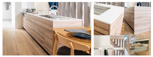 ワークトップにはアイカ工業(名古屋市)の抗ウイルス建材「ウイルテクト」を、キャビネット面材には抗菌性のある素材を採用。ワークトップの厚みを20mmと薄くすることでスッキリとした印象に仕上げ、奥行を750mm確保することで広い調理スペースを確保した。面材はメープルやウォールナットなどの木目、石目、ターコイズブルーなど8種類。 ペニンシュラタイプの標準仕様が95万円(税別)。