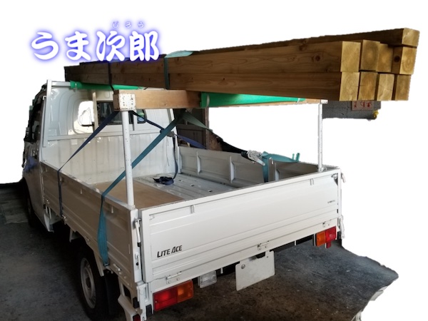 門型のフレームは、棒受け2本、差し込み棒2本、90mm角または75mm角の荷受け用木材1本で構成する。従来のように積載物が斜めにならないため、走行中のズリ落ちを防ぐとともに、高さがないトンネルや屋根の低い駐車場にも対応。また、長尺資材はキャリアの上に固定するため、その下の荷台スペースを有効に使うことができる。
