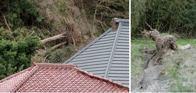 左/斜面地で風に倒され、家の近くまで落ちてきた樹木。斜面と建物の距離に配慮が必要