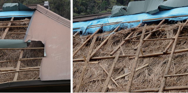 右/茅葺きを鋼板で覆うための垂木は屋根に置いているような状態。耐風性能は低い