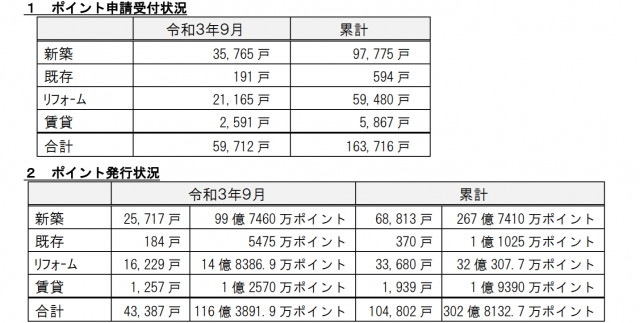 9月のポイント申請の合計は5万9712戸で、その内、新築が3万5765戸、リフォームが2万1165戸だった。ポイント発行数は、新築が2万5717戸で99億7460万ポイント、リフォームが1万6229戸で14億8386.9万ポイントだった。