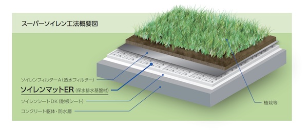 軽量の屋上緑化システム「スーパーソイレン工法」の構成材の1つである保水排水基盤材。使用している発泡性ポリスチレンビーズ「エプスレム」は100%リサイクルの難燃素材で、生産時(ビーズ生産から発泡成形まで)のCO2排出量を従来品よりも21%削減できるとする。