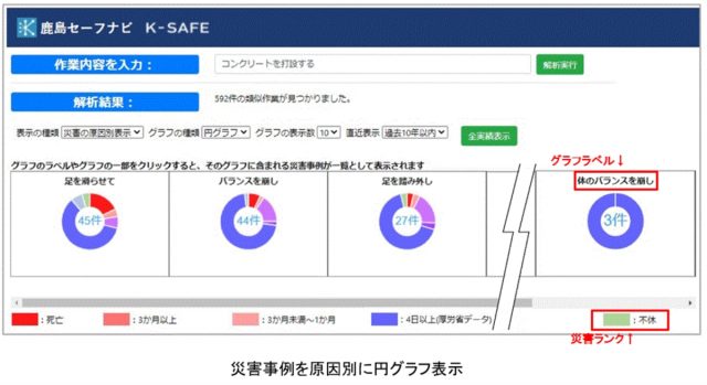 同システムでは、同社が保有する約5000件の災害事例と、厚生労働省が運営する「職場のあんぜんサイト」に掲載されている約6万4000件の災害事例をAIを用いて解析。システム上に作業内容(コンクリートを打設するなど)を入力すると、類似作業における災害事例がグラフ表示される。グラフ表示は災害の原因や状況別などに切り替えができるため、それぞれの災害件数を一目で把握できる。同システムを活用することで、現場の安全担当者に対して各種作業の災害事例を多面的に提示できるようになるため、危険予知活動の精度が飛躍的に向上すると同社。