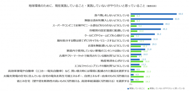 その結果、地球環境のために、実践していないがやりたいと思っていることの上位3位は「高効率家電やエコカーの選択」、「太陽光発電、再生可能エネルギーの利用」、「省エネ住宅の選択」となった。環境効果は高いが個人の金銭的負担が多い項目は、実践したいものの実践できていない人が多い結果となった。