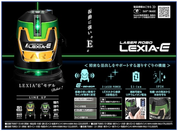視認性の高い緑色レーザーを採用し、明るさを3段階(弱・中・強)で切り替えられる「レーザーロボLEXIA」に、振動が多い現場でもラインが素早く安定する電子整準機能「E-sensor」を搭載。着脱可能はリチウムイオンバッテリーはひと目で充電残量がわかる。防塵・防水仕様のため、粉塵・水飛沫による故障の心配がないという。税込11万円〜。