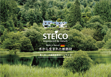 木繊維断熱材シュタイコは針葉樹の端材が原料。そのためイソシアネートを含む接着剤やホルムアルデヒドなど、防蟻処理も含めて有害な化学物質は不使用。水や空気など環境に配慮した製造工程で管理され、梱包材に至るまで再利用可能な素材で作られている。また、製品製造中の厳しい管理以外にも、第三者機関による原材料の継続的な管理下で、排出物がなく、危険性がないことが認定されている。