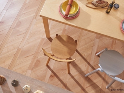 業界初のデザインを採用したフローリング。森林の採光の風景をイメージした斬新な柄は、黄金比を採用しており、斜めと縦の交錯が美しい。従来のヘリンボーンと比較し、コスト面、施工性に優れた1×6サイズの仕様で、業界初、シートフローリングで柄に合わせた横溝を入れる技術も搭載。抗ウイルス・抗菌仕様(SIAAマーク取得)で、住まいの床を衛生的に保つことが可能。