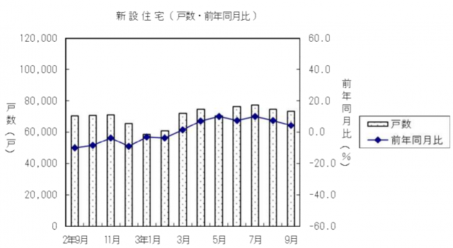国土交通省が10月29日発表した9月の新設住宅着工戸数は、分譲住宅は減少したが、持家と貸家が増加したため、前年同月比4.3%増の7万3178戸となり、7カ月連続の増加となった。季節調整済年率換算値は、前月比1.2%減の84.5万戸。