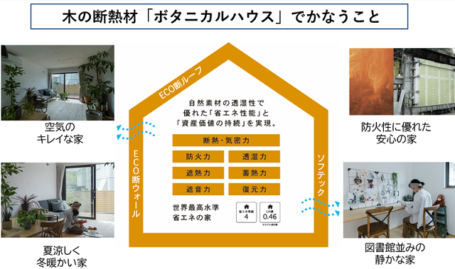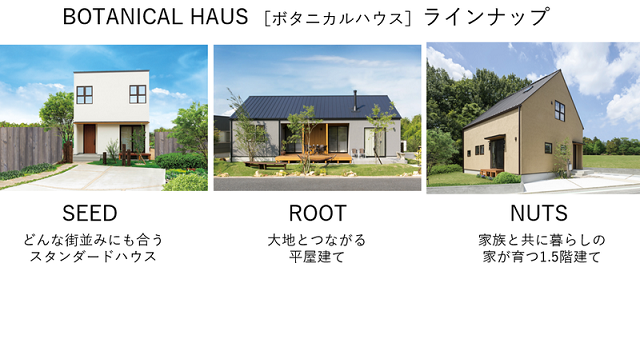 ボタニカルハウスは、ドイツGUTEX社の木の断熱材「ECOボード」を使用しているのが最大の特徴。ECOボードは、100年住宅を実現するドイツで最も使われている断熱材といい、高い断熱性、吸音性、調湿性などの性能を備える。規格住宅は、スタンダードハウス「SEED」、平屋建て「ROOT」、1.5階建て「NUTS」をラインアップ。夏涼しく、冬暖かい「性能」と「資産価値」が持続する、地球環境の未来を見据えた住まいとなっている。