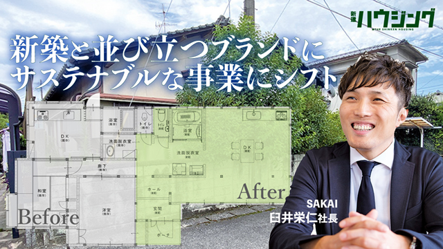 8月にリノベーションに特化したブランド「OITAリノベ」を立ち上げたSAKAI(大分市)は、同市内にある築50年の空き家をリノベし、12月からリノベ事業専用の常設モデルハウスとして運用する。視覚や体感でリノベの効果を生活者に分かりやすく訴求。水まわりなど小規模なリフォームとは差別化し、モデルハウスなどによる仕掛けで潜在的な需要を掘り起こしながら、性能向上をメインに住まいの価値を転換するリノベーションを事業として確立していく考えだ。