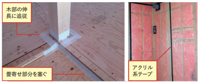 ◉少し前まで気密テープは黒色だったが、最近は白色が多い(上写真:右)。構造見学会の際の見た目がよいことから採用されている