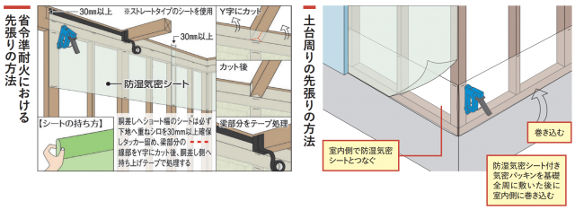 ◉防湿気密シートを連続させるには先張りして気密シートを連続させるのが基本。上棟直後に先張りシートを施工する