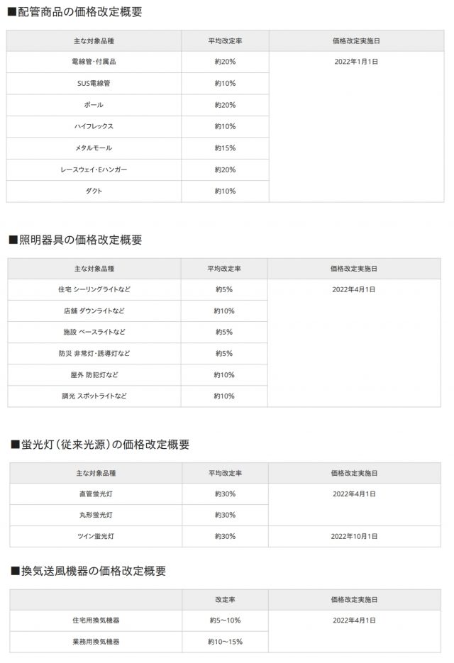 電線管、ダクト等の配管商品は、2022年1月1日から平均10~20%値上げする。住宅用シーリングライト、高天井照明器具、防犯灯、スポットライト等の照明器具は、2022年4月1日からで平均5%~10%の値上げ。住宅用シーリングライトは約5%の値上げとなる。直管・丸形蛍光灯は2022年4月1日から、ツイン蛍光灯は2022年10月1日から、約30%の値上げ。天井埋込形換気扇、レンジフード、バス換気乾燥機等の換気送風商品は2022年4月1日からで、住宅用は5~10%の値上げとしている。