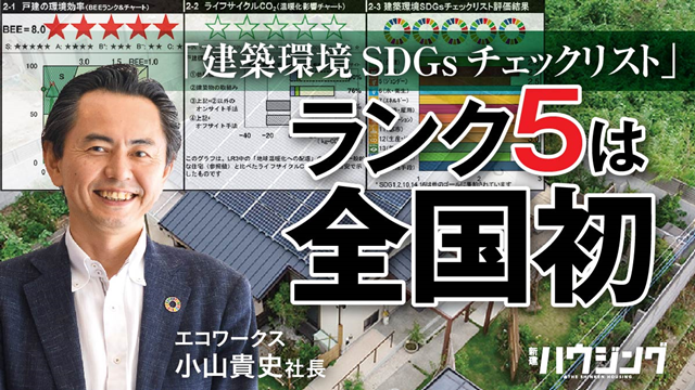エコワークス(福岡市)が建築した住宅が、「CASBEE-戸建(新築)」の2021年版における評価基準3部門全てで最高等級を取得した。環境効率およびライフサイクルCO2に加え、建築環境SDGsチェックリスト評価でも、最高ランクの5を取得。建築環境SDGsチェックリスト評価のランク5評価は全国初の事例となる。