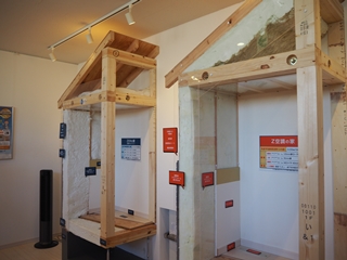 Z空調の家とZEHの断熱材の違いがわかる。手前がZ空調の家、奥がZHEの家
