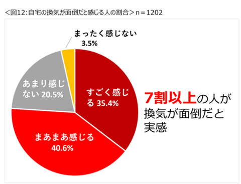 『自宅の換気が面倒と感じるか』との問いに対しては、7割以上の人が「すごく感じる・まあまあ感じる」と回答。新型コロナウイルスの影響で意識するようにはなったが、換気自体は面倒だと感じている人が多いことがわかった。