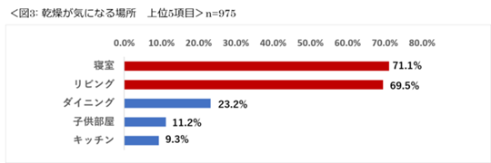 『乾燥が気になるタイミング』としては「暖房している時」が70.5%と最多。次いで「起床時」(50.3%)、「就寝時」(42.9%)となった。『乾燥が気になる場所』としては「寝室」が71.1%、「リビング」が69.5%となった。