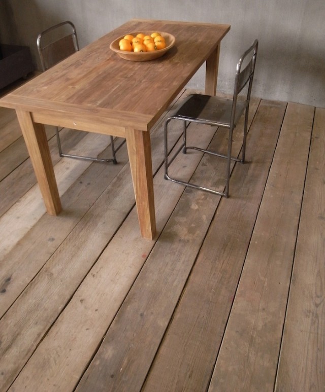 ヨーロッパ各地の建設現場などで約5年間、足場材として使われてきた無塗装のパイン材で、「古材と比べても引けを取らない」という色合いや質感が特徴。施工性にすぐれ、店舗から個人住宅まで幅広く利用できる。
