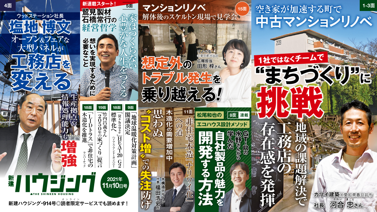 新建ハウジング最新11月10日号トップ記事は、中古マンションのリノベーションプロジェクト(買取再販事業)にチャレンジする、カワイ建築(愛知県春日井市)を取り上げました。地域資源や人材を生かしながら、その地域にある課題をビジネスの手法で解決するコミュニティビジネスの先進事例です。建物の老朽化や住人の高齢化が進む地元で、リノベに留まらない“まちづくり”に挑戦する姿に迫りました。
