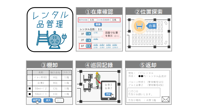 「レンタル品管理」は、台車や仮設照明などのレンタル品を総合的に管理できるアプリ。現場内のレンタル品を種類や協力会社で絞り込み、フロアごとに集計して表示する「在庫確認」機能や、レンタル品の所在位置を平面図上に表示する「位置探索」機能、現場内のレンタル品の在庫確認を実施する「棚卸し」機能などを搭載。そのほか、レンタル品の所在更新や返却もアプリから行える。同アプリを使うことで、レンタル品の管理時間は最大86%の削減、レンタルコストは約10%の削減が期待できるという。