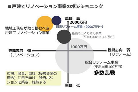 戸建てリノベ―ションの領域で実績を伸ばせる工務店は、新築で長期優良住宅を標準化させ、温熱でHEAT20・G2、構造で耐震等級3を狙える設計・施工力を持っている会社が前提となる。新築でこだわりを持つ工務店は、その提供価値をリノベにも展開することで新しい需要に応えることができる。中長期的には新築需要の減少傾向に対して早めの対策が取れる。技術力を磨いてきた工務店にとって、自社の経営資源を生かせる環境が整ってきたと言える。